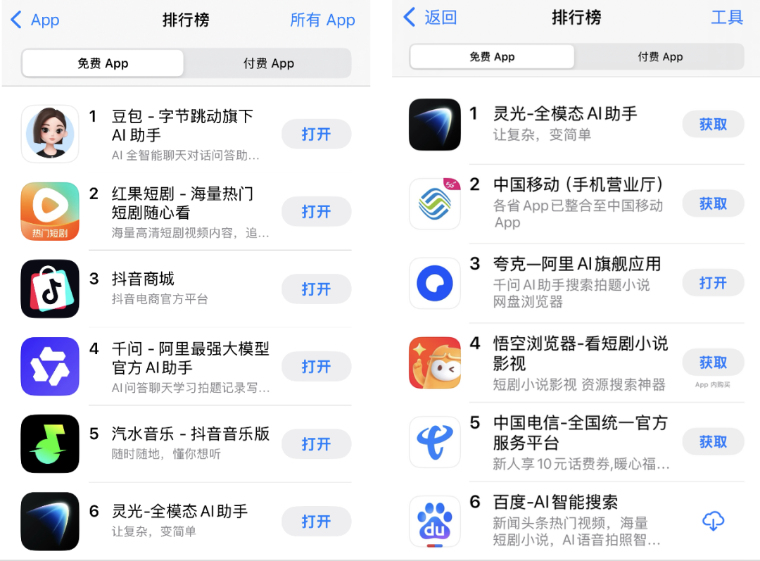 同一天,今天同样出身杭州的阿里AI应用千问App可谓横扫硅谷,公测一周下载破1000万。随着灵光和阿里千问的双双突围,原本被字节系霸屏的C端AI市场,已经被撕开一个口子。至11月21日,App Store中国区免费榜T0P6,被字节系和阿里系包圆,“北字节南阿里”的创新格局初步成型。